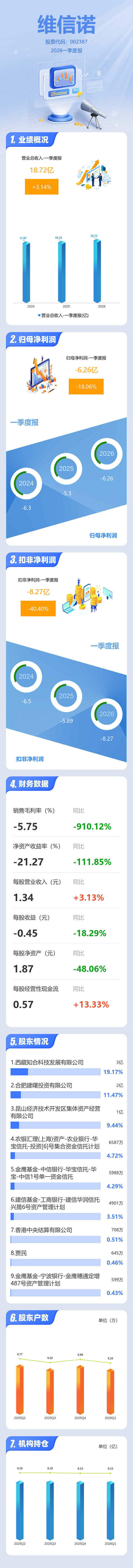 证券之星消息,维信诺2026年一季报显示,一季度公司主营收入18.72亿元,同比上升3.14%;归母净利润-6.26亿元,同比下降18.06%;扣非净利润-8.27亿元,同比下降40.41%;负债率86.23%,投资收益-1.27亿元,财务费用2.11亿元,毛利率-5.75%。