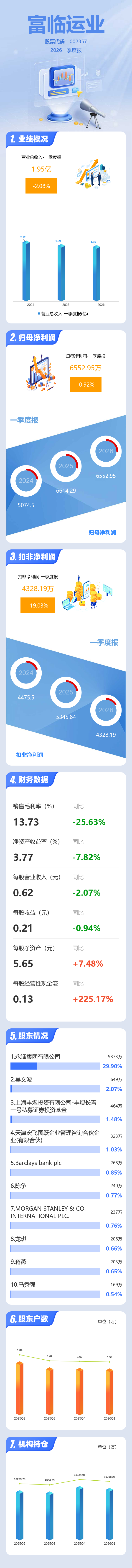 证券之星消息,富临运业2026年一季报显示,一季度公司主营收入1.95亿元,同比下降2.08%;归母净利润6552.95万元,同比下降0.93%;扣非净利润4328.19万元,同比下降19.04%;负债率38.18%,投资收益6456.98万元,财务费用399.11万元,毛利率13.73%。