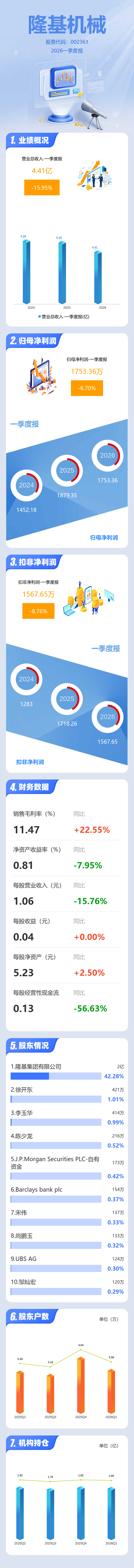 证券之星消息,隆基机械2026年一季报显示,一季度公司主营收入4.41亿元,同比下降15.96%;归母净利润1753.36万元,同比下降6.7%;扣非净利润1567.65万元,同比下降8.77%;负债率24.46%,投资收益63.49万元,财务费用464.99万元,毛利率11.47%。