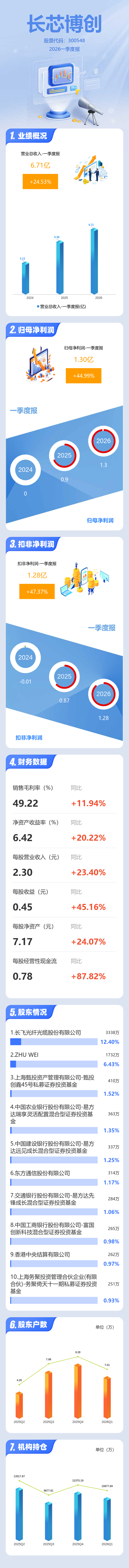 证券之星消息,长芯博创2026年一季报显示,一季度公司主营收入6.71亿元,同比上升24.53%;归母净利润1.3亿元,同比上升45.0%;扣非净利润1.28亿元,同比上升47.37%;负债率28.33%,投资收益1.24万元,财务费用983.51万元,毛利率49.22%。
