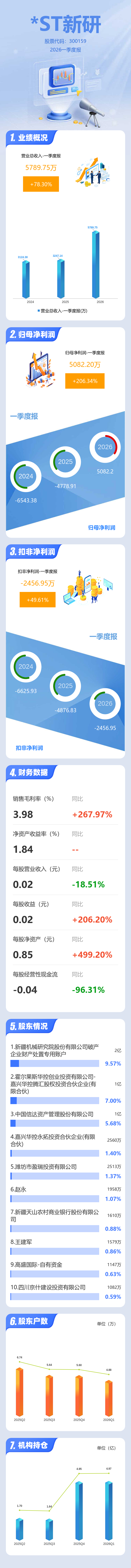 证券之星消息,*ST新研2026年一季报显示,一季度公司主营收入5789.75万元,同比上升78.3%;归母净利润5082.2万元,同比上升206.35%;扣非净利润-2456.95万元,同比上升49.62%;负债率16.13%,投资收益7083.95万元,财务费用-296.8万元,毛利率3.98%。