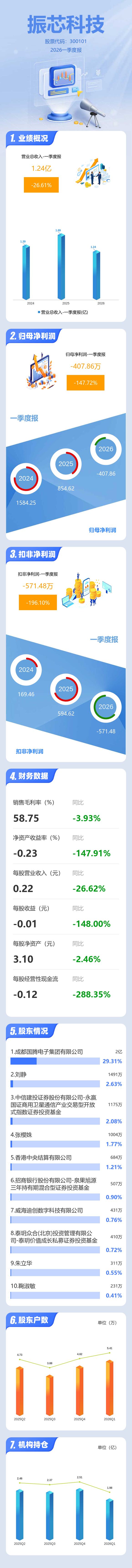 证券之星消息,振芯科技2026年一季报显示,一季度公司主营收入1.24亿元,同比下降26.62%;归母净利润-407.86万元,同比下降147.72%;扣非净利润-571.48万元,同比下降196.11%;负债率36.29%,投资收益0.71万元,财务费用223.46万元,毛利率58.75%。