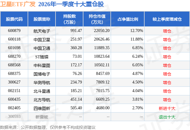 卫星ETF广发基金成立于2025年10月13日,基金经理为吕鑫,基金跟踪标的为中证卫星产业指数,成立以来超额回报为3.09%,近一个月超额回报为0.13%。最新披露的基金持仓数据显示,截止2026年3月31日,该基金第一大重仓股为航天电子(600879),持股占比为12.7%。
