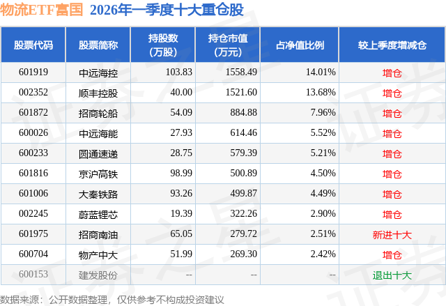 物流ETF富国基金成立于2021年6月3日,基金经理为刘海燕,基金跟踪标的为中证现代物流指数,成立以来超额回报为12.2%,近一个月超额回报为-0.04%。最新披露的基金持仓数据显示,截止2026年3月31日,该基金第一大重仓股为中远海控(601919),持股占比为14.01%。
