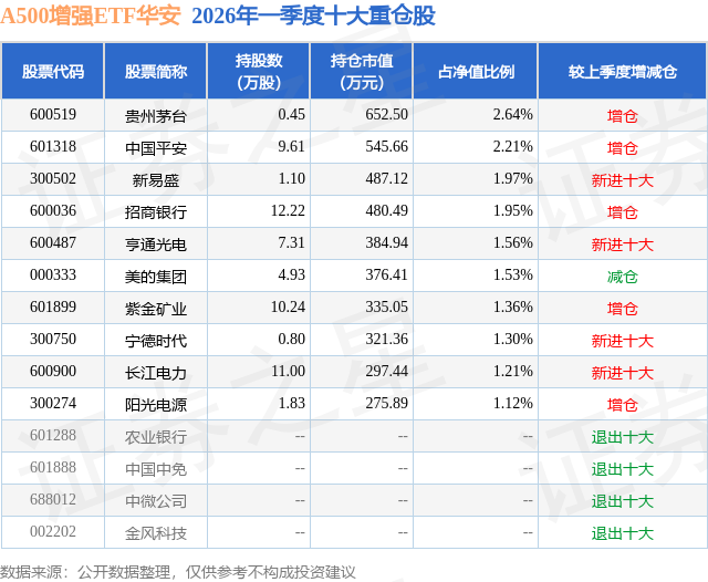 A500增强ETF华安基金成立于2025年6月18日,基金经理为张序 王超,基金跟踪标的为中证A500指数,成立以来超额回报为-6.55%,近一个月超额回报为-0.23%。最新披露的基金持仓数据显示,截止2026年3月31日,该基金第一大重仓股为贵州茅台(600519),持股占比为2.64%。