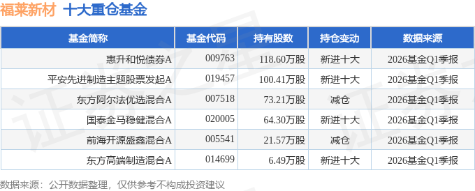 持有福莱新材最多的基金为惠升和悦债券A,目前规模为39.01亿元,最新净值1.0761(4月28日),较上一交易日下跌0.95%,近一年上涨4.59%。该基金现任基金经理为曾华 孙庆。