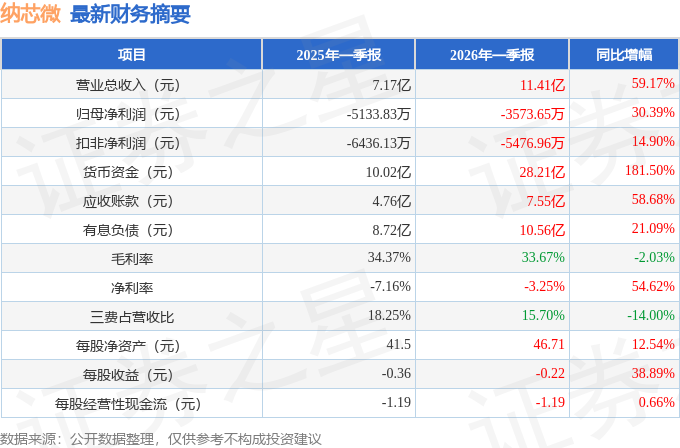 据证券之星公开数据整理,近期纳芯微(688052)发布2026年一季报。根据财报显示,纳芯微营收上升亏损收窄。截至本报告期末,公司营业总收入11.41亿元,同比上升59.17%,归母净利润-3573.65万元,同比上升30.39%。按单季度数据看,第一季度营业总收入11.41亿元,同比上升59.17%,第一季度归母净利润-3573.65万元,同比上升30.39%。