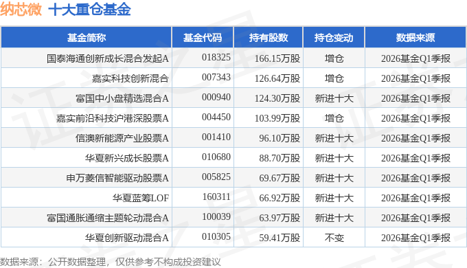 持有纳芯微最多的基金为国泰海通创新成长混合发起A,目前规模为13.24亿元,最新净值1.9526(4月28日),较上一交易日下跌0.93%,近一年上涨143.65%。该基金现任基金经理为陈思靖。