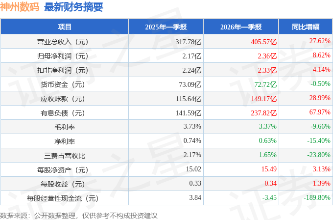 据证券之星公开数据整理,近期神州数码(000034)发布2026年一季报。截至本报告期末,公司营业总收入405.57亿元,同比上升27.62%,归母净利润2.36亿元,同比上升8.62%。按单季度数据看,第一季度营业总收入405.57亿元,同比上升27.62%,第一季度归母净利润2.36亿元,同比上升8.62%。本报告期神州数码公司应收账款体量较大,当期应收账款占最新年报归母净利润比达2852.44%。