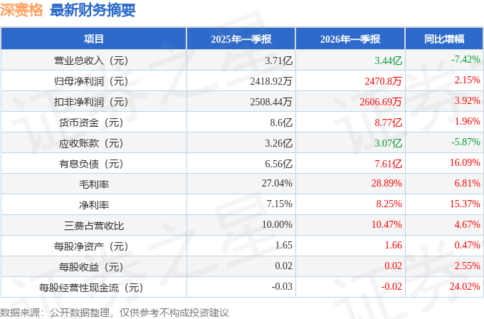 据证券之星公开数据整理,近期深赛格(000058)发布2026年一季报。截至本报告期末,公司营业总收入3.44亿元,同比下降7.42%,归母净利润2470.8万元,同比上升2.15%。按单季度数据看,第一季度营业总收入3.44亿元,同比下降7.42%,第一季度归母净利润2470.8万元,同比上升2.15%。本报告期深赛格盈利能力上升,毛利率同比增幅11.45%,净利率同比增幅18.49%。