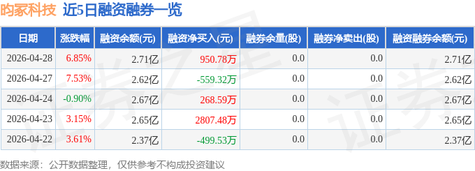 昀冢科技融资融券信息显示,融资方面,当日融资买入3343.71万元,融资偿还2392.93万元,融资净买入950.78万元。融券方面,融券卖出0.0股,融券偿还0.0股,融券余量0.0股,融券余额0.0万元。融资融券余额2.71亿元。