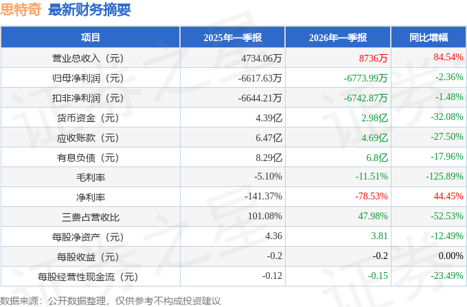 据证券之星公开数据整理,近期思特奇(300608)发布2026年一季报。截至本报告期末,公司营业总收入8736.0万元,同比上升84.54%,归母净利润-6773.99万元,同比下降2.36%。按单季度数据看,第一季度营业总收入8736.0万元,同比上升84.54%,第一季度归母净利润-6773.99万元,同比下降2.36%。本报告期思特奇公司应收账款体量较大,当期应收账款占最新年报营业总收入比达76.03%。