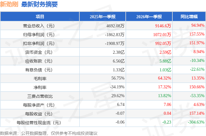 据证券之星公开数据整理,近期新劲刚(300629)发布2026年一季报。截至本报告期末,公司营业总收入9146.6万元,同比上升94.94%,归母净利润1072.01万元,同比上升157.55%。按单季度数据看,第一季度营业总收入9146.6万元,同比上升94.94%,第一季度归母净利润1072.01万元,同比上升157.55%。本报告期新劲刚盈利能力上升,毛利率同比增幅13.35%,净利率同比增幅150.66%。