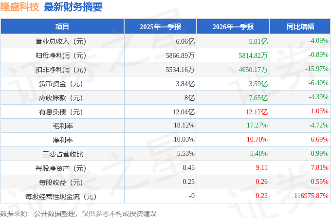 据证券之星公开数据整理,近期隆盛科技(300680)发布2026年一季报。截至本报告期末,公司营业总收入5.81亿元,同比下降4.09%,归母净利润5814.82万元,同比下降0.89%。按单季度数据看,第一季度营业总收入5.81亿元,同比下降4.09%,第一季度归母净利润5814.82万元,同比下降0.89%。本报告期隆盛科技公司应收账款体量较大,当期应收账款占最新年报归母净利润比达318.46%。