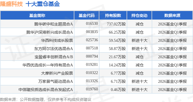 持有隆盛科技最多的基金为鹏华碳中和主题混合A,目前规模为32.06亿元,最新净值1.7471(4月28日),较上一交易日下跌3.12%,近一年上涨14.13%。该基金现任基金经理为闫思倩。