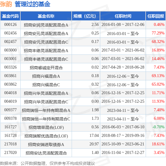 张韵女士:中国国籍,硕士。2012年9月加入国泰基金管理有限公司,曾任研究员、基金经理助理;2015年加入招商基金管理有限公司,现任招商安润保本混合型证券投资基金(管理时间:2016年1月8日至今)、招商安元保本混合型证券投资基金(管理时间:2016年3月1日至今)、招商增荣灵活配置混合型证券投资基金(管理时间:2016年6月3日至今)、招商安达保本混合型证券投资基金(管理时间:2016年11月4日至今)、招商兴福灵活配置混合型证券投资基金(管理时间:2016年12月6日至今)、招商兴华灵活配置混合型证券投资基金(管理时间:2016年12月16日至今)基金经理。拟任招商睿诚定期开放混合型证券投资基金基金经理。2023年4月11日起担任招商瑞恒一年持有期混合型证券投资基金基金经理。曾任招商安瑞进取债券型证券投资基金基金经理。