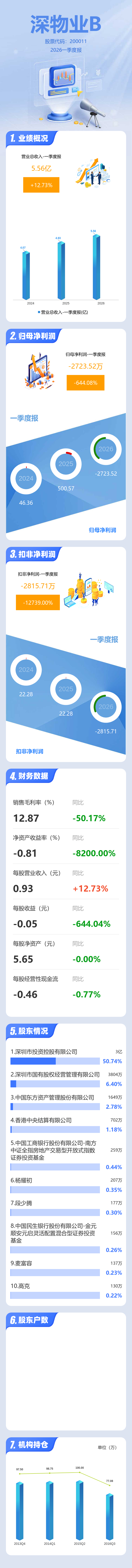 证券之星消息,深物业B2026年一季报显示,一季度公司主营收入5.56亿元,同比上升12.73%;归母净利润-2723.52万元,同比下降644.08%;扣非净利润-2815.71万元,同比下降12739.0%;负债率78.75%,投资收益-296.05万元,财务费用3601.15万元,毛利率12.87%。