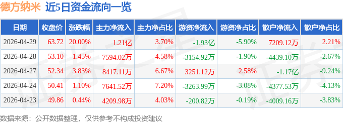 证券之星消息,德方纳米4月29日涨停收盘,收盘价63.72元。该股于10点51分涨停,未打开涨停,截止收盘封单资金为2.09亿元,占其流通市值1.3%。