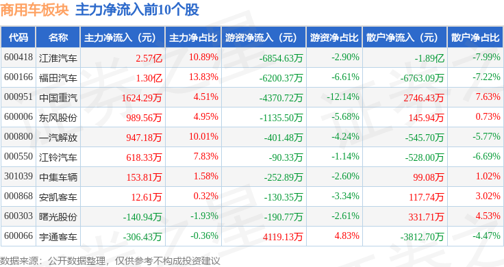 从资金流向上来看,当日商用车板块主力资金净流入3.08亿元,游资资金净流出9534.41万元,散户资金净流出2.13亿元。商用车板块个股资金流向见下表: