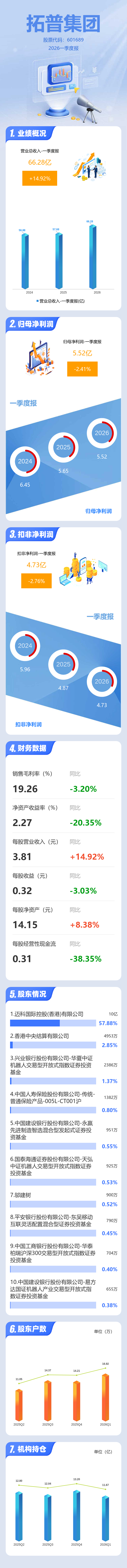 证券之星消息,拓普集团2026年一季报显示,一季度公司主营收入66.28亿元,同比上升14.92%;归母净利润5.52亿元,同比下降2.42%;扣非净利润4.73亿元,同比下降2.77%;负债率40.77%,投资收益788.31万元,财务费用9643.76万元,毛利率19.26%。