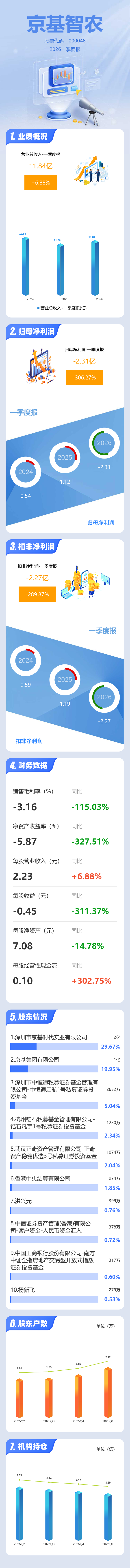 证券之星消息,京基智农2026年一季报显示,一季度公司主营收入11.84亿元,同比上升6.88%;归母净利润-2.31亿元,同比下降306.27%;扣非净利润-2.27亿元,同比下降289.87%;负债率62.35%,投资收益0.76万元,财务费用1556.68万元,毛利率-3.15%。