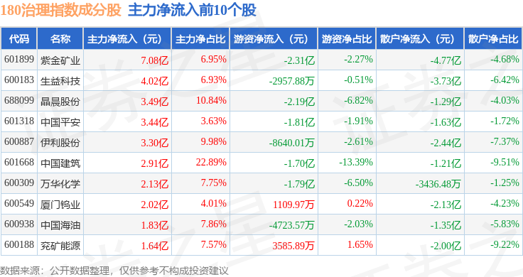 资金流向方面,180治理(000021)指数成份股当日主力资金净流出合计5.86亿元,游资资金净流入合计1.78亿元,散户资金净流入合计4.08亿元。成份股资金流向详情见下表: