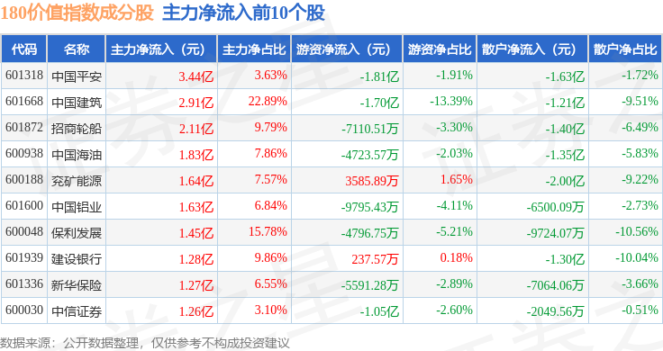 资金流向方面,180价值(000029)指数成份股当日主力资金净流出合计8.38亿元,游资资金净流入合计3.53亿元,散户资金净流入合计4.85亿元。成份股资金流向详情见下表: