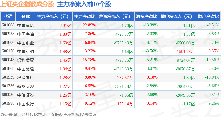 资金流向方面,上证央企(000042)指数成份股当日主力资金净流出合计23.09亿元,游资资金净流入合计5.44亿元,散户资金净流入合计17.65亿元。成份股资金流向详情见下表: