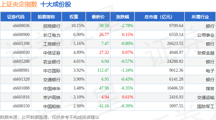 上证央企(000042)指数十大成份股详情如下: