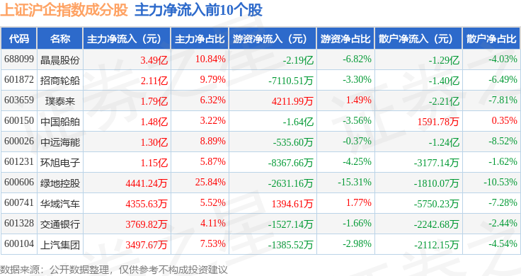 资金流向方面,上证沪企(000062)指数成份股当日主力资金净流出合计15.23亿元,游资资金净流入合计9.67亿元,散户资金净流入合计5.56亿元。成份股资金流向详情见下表: