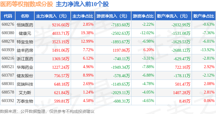 资金流向方面,医药等权(000075)指数成份股当日主力资金净流出合计10.93亿元,游资资金净流入合计2.21亿元,散户资金净流入合计8.72亿元。成份股资金流向详情见下表: