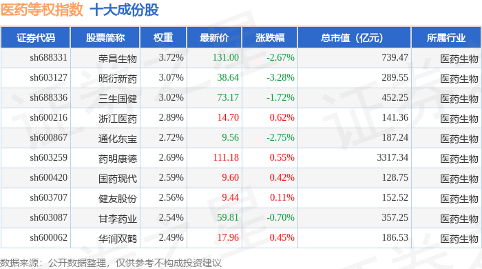医药等权(000075)指数十大成份股详情如下: