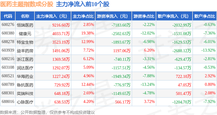 资金流向方面,医药主题(000121)指数成份股当日主力资金净流出合计10.89亿元,游资资金净流入合计2.26亿元,散户资金净流入合计8.63亿元。成份股资金流向详情见下表: