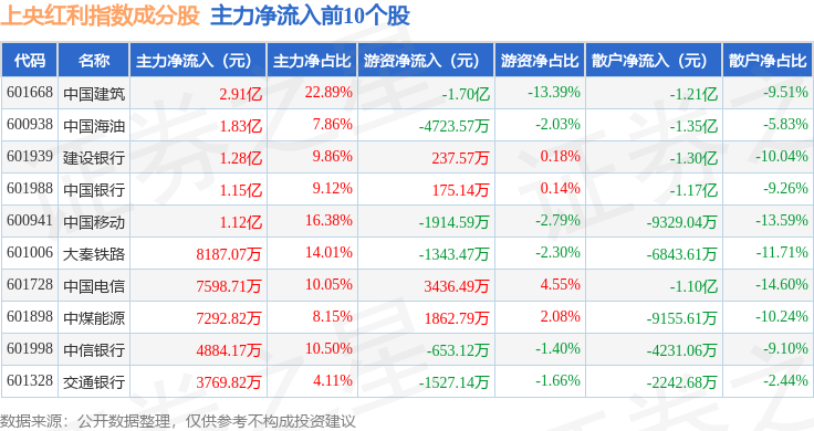 资金流向方面,上央红利(000152)指数成份股当日主力资金净流出合计17.62亿元,游资资金净流入合计6.35亿元,散户资金净流入合计11.27亿元。成份股资金流向详情见下表: