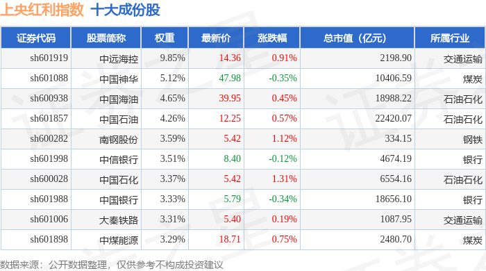 证券之星消息,4月29日,上央红利(000152)指数报收于2924.02点,涨0.07%,成交387.35亿元,换手率0.25%。当日该指数成份股中,上涨的有18家,中国黄金以2.88%的涨幅领涨,下跌的有11家,中远海特以4.98%的跌幅领跌。