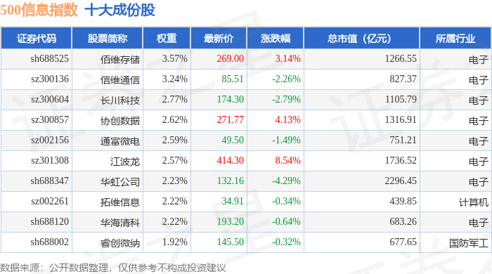 证券之星消息,4月29日,500信息(000858)指数报收于12152.83点,涨0.83%,成交1382.42亿元,换手率3.47%。当日该指数成份股中,上涨的有49家,盛科通信以14.69%的涨幅领涨,下跌的有35家,安集科技以5.03%的跌幅领跌。