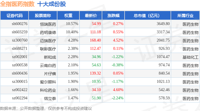 全指医药(000991)指数十大成份股详情如下: