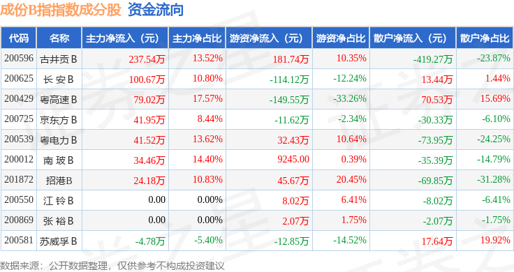 资金流向方面,成份B指(399003)指数成份股当日主力资金净流入合计554.56万元,游资资金净流出合计17.29万元,散户资金净流出合计537.27万元。成份股资金流向详情见下表: