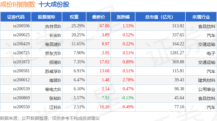 成份B指(399003)指数十大成份股详情如下: