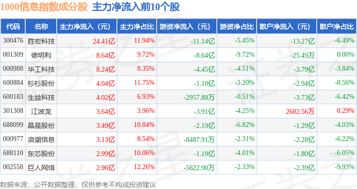 资金流向方面,1000信息(399388)指数成份股当日主力资金净流出合计88.51亿元,游资资金净流入合计10.46亿元,散户资金净流入合计78.05亿元。成份股资金流向详情见下表: