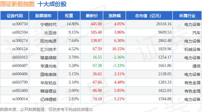 证券之星消息,4月29日,国证新能(399412)指数报收于3278.07点,涨3.76%,成交1681.75亿元,换手率1.93%。当日该指数成份股中,上涨的有41家,湖南裕能以15.48%的涨幅领涨,下跌的有8家,中国广核以3.61%的跌幅领跌。