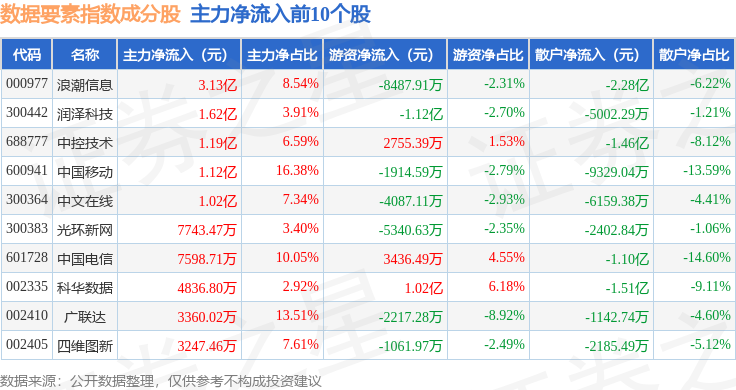 资金流向方面,数据要素(399418)指数成份股当日主力资金净流出合计8.71亿元,游资资金净流入合计5.87亿元,散户资金净流入合计2.84亿元。成份股资金流向详情见下表: