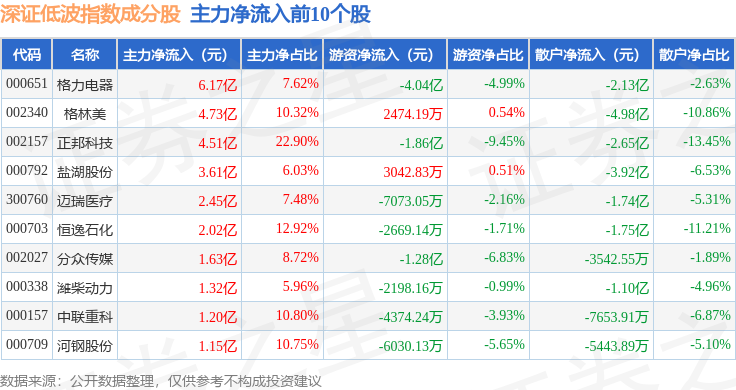 资金流向方面,深证低波(399661)指数成份股当日主力资金净流入合计23.13亿元,游资资金净流出合计5.8亿元,散户资金净流出合计17.33亿元。成份股资金流向详情见下表:
