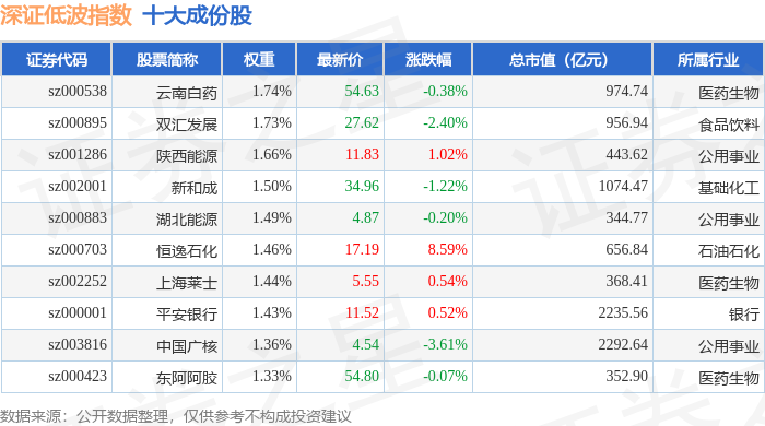 证券之星消息,4月29日,深证低波(399661)指数报收于6177.92点,涨1.29%,成交911.79亿元,换手率1.38%。当日该指数成份股中,上涨的有70家,恒逸石化以8.59%的涨幅领涨,下跌的有28家,粤电力A以3.71%的跌幅领跌。