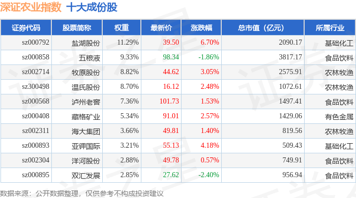 证券之星消息,4月29日,深证农业(399669)指数报收于8333.2点,涨2.0%,成交322.51亿元,换手率2.22%。当日该指数成份股中,上涨的有41家,百润股份以10.0%的涨幅领涨,下跌的有9家,中坚科技以10.0%的跌幅领跌。
