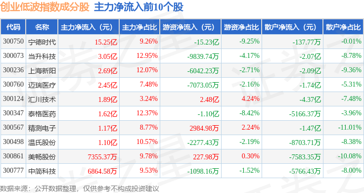 资金流向方面,创业低波(399692)指数成份股当日主力资金净流入合计16.63亿元,游资资金净流出合计11.5亿元,散户资金净流出合计5.13亿元。成份股资金流向详情见下表: