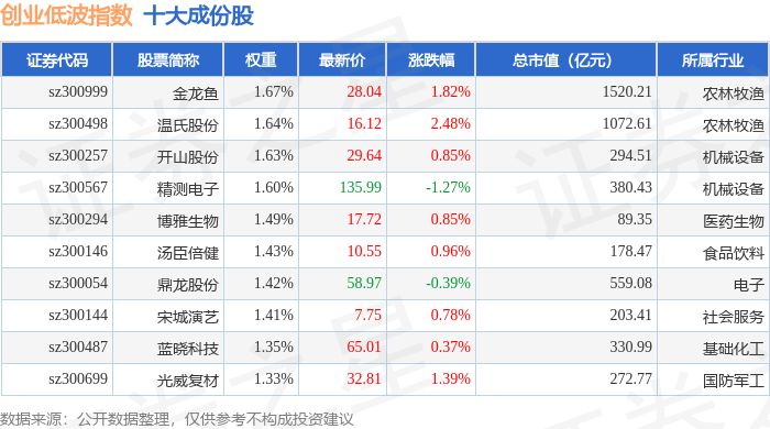 证券之星消息,4月29日,创业低波(399692)指数报收于3981.29点,涨0.69%,成交829.02亿元,换手率2.09%。当日该指数成份股中,上涨的有63家,汇川技术以10.15%的涨幅领涨,下跌的有35家,嘉益股份以10.73%的跌幅领跌。