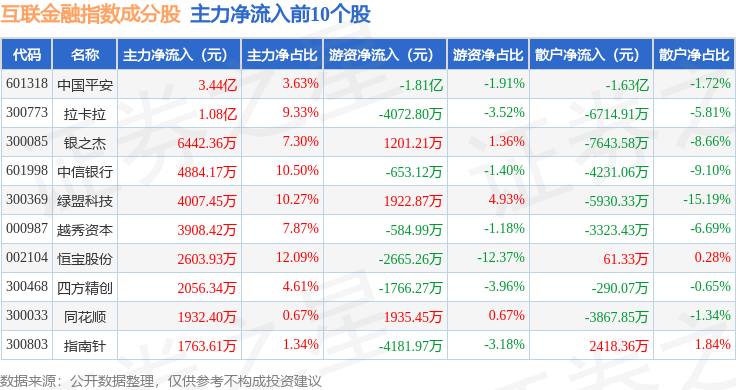 资金流向方面,互联金融(399805)指数成份股当日主力资金净流入合计1.03亿元,游资资金净流出合计3.66亿元,散户资金净流入合计2.69亿元。成份股资金流向详情见下表: