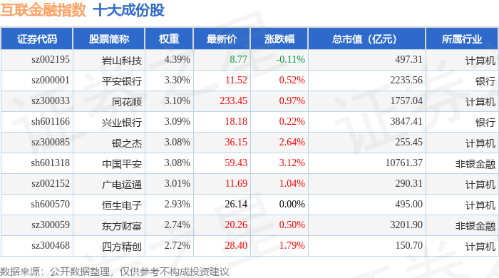 证券之星消息,4月29日,互联金融(399805)指数报收于3304.45点,涨0.9%,成交406.3亿元,换手率1.25%。当日该指数成份股中,上涨的有51家,安硕信息以7.75%的涨幅领涨,下跌的有11家,绿盟科技以4.73%的跌幅领跌。