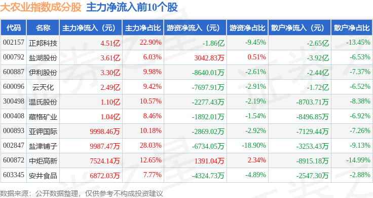 资金流向方面,大农业(399814)指数成份股当日主力资金净流入合计20.51亿元,游资资金净流出合计5.96亿元,散户资金净流出合计14.56亿元。成份股资金流向详情见下表: